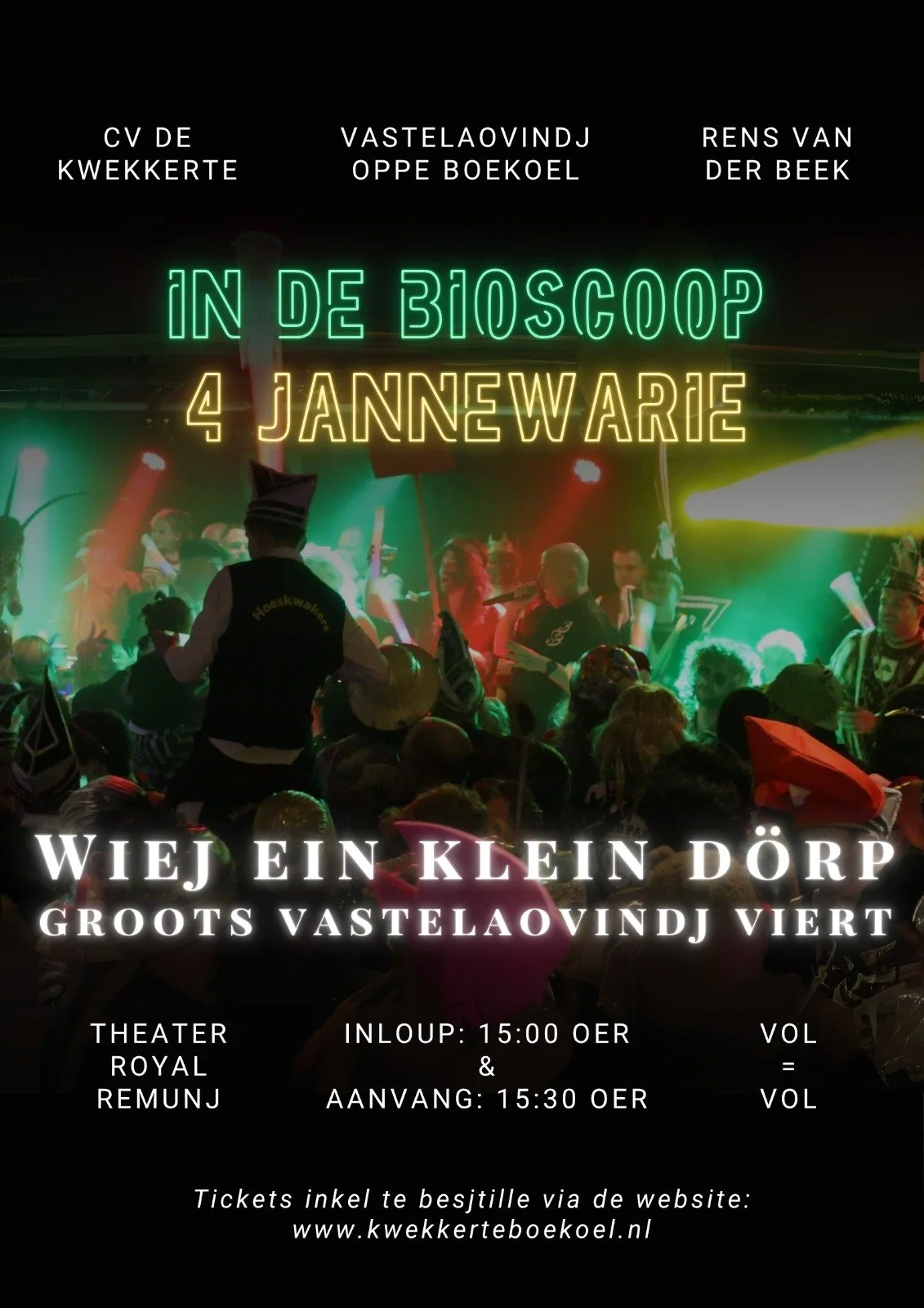 Deze documenaire is gemaak nao aanleiding van ‘t 7 x 11 jäörig jubileum van CV De Kwekkerte in 2025. In dees documenaire krieg geur ein inkiekske in vastelaovindj vierend Boekoel. Wilt geur dit neet misse? Koup den, via de ongersjtaonde link, ein entreekaertje veur de vertoning van de documentaire op zonjig 4 jannewari om 15:30 oer. De biscoopzaal haed ein beperk aantal plaatse, dus ouch veur deze kaartverkoup geldj: op = op.